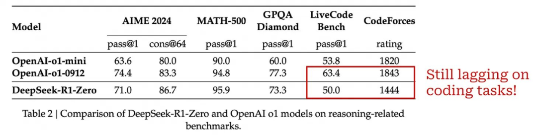 下表给出了 DeepSeek-R1-Zero 和 o1 模型之间的完整性能比较。DeepSeek-R1-Zero 在大多数情况下与 o1-mini 的性能相当或超过 o1-mini,并且在几个任务上的表现与 o1-preview 相当。然而,OpenAI 的推理模型在编程领域表现更好 ——DeepSeek-R1-Zero 显然是一个较弱的编程模型。我们很快就会看到,这个问题在 DeepSeek-R1(后续模型)中得到了解决。