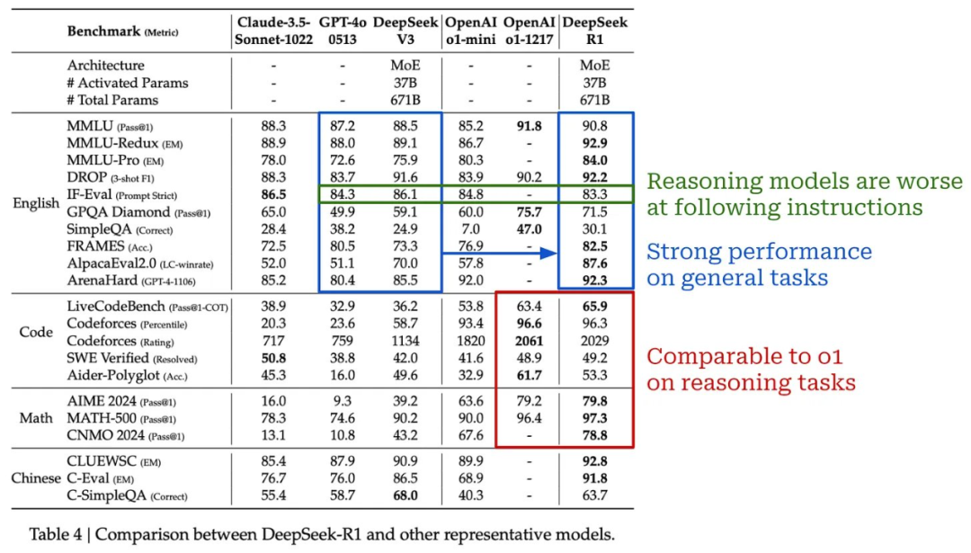 它的表现如何?如上所示,R1 在大多数推理任务上的表现与 o1 相当甚至超过 o1。与 R1-Zero 不同,R1 还具有相当强的编程能力。在通用任务上,由于其混合训练管道,R1 继续表现良好。总的来说,R1 是一个非常强大的模型,似乎与 OpenAI 的 o1 不相上下,并且可以高精度地解决各种任务(包括传统任务和推理导向任务)。