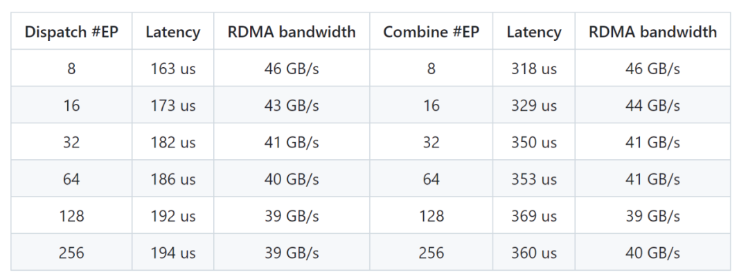 DeepSeek 在 H800 上测试常规内核(NVLink 最大带宽约 160 GB/s),每个 H800 连接到一个 CX7 InfiniBand 400 Gb/s RDMA 网卡(最大带宽约 50 GB/s)。他们遵循 DeepSeek-V3/R1 预训练设置(每批次 4096 个 token,7168 隐藏维度,top-4 组,top-8 专家,FP8 分发和 BF16 合并)。