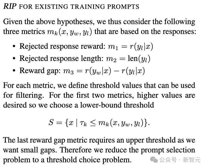 基于上述两个假设,RIP方法就可以测量被拒绝的响应质量(下图m_1),以及被选择和被拒绝的响应之间的奖励差距(reward gap,下图m_3),从而评估数据的完整性。