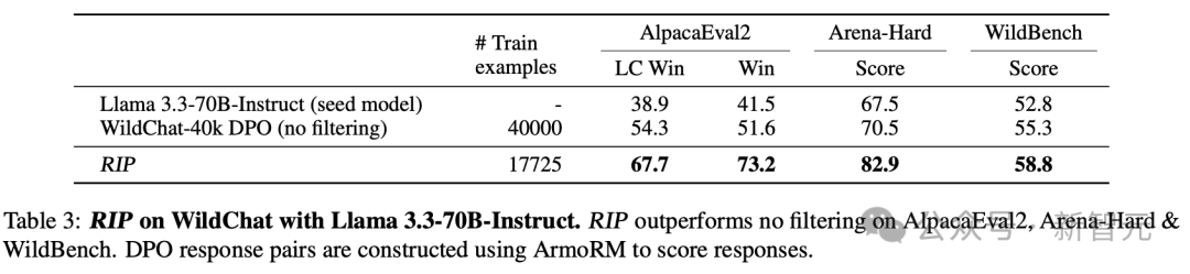 在更大参数的模型上,RIP同样有效。过滤显著提升了Llama 3.3-70B-Instruct模型的性能,AlpacaEval2 LC胜率从38.9提升至67.7,Arena Hard从67.5提升至82.9,WildBench从52.8提升至58.8。