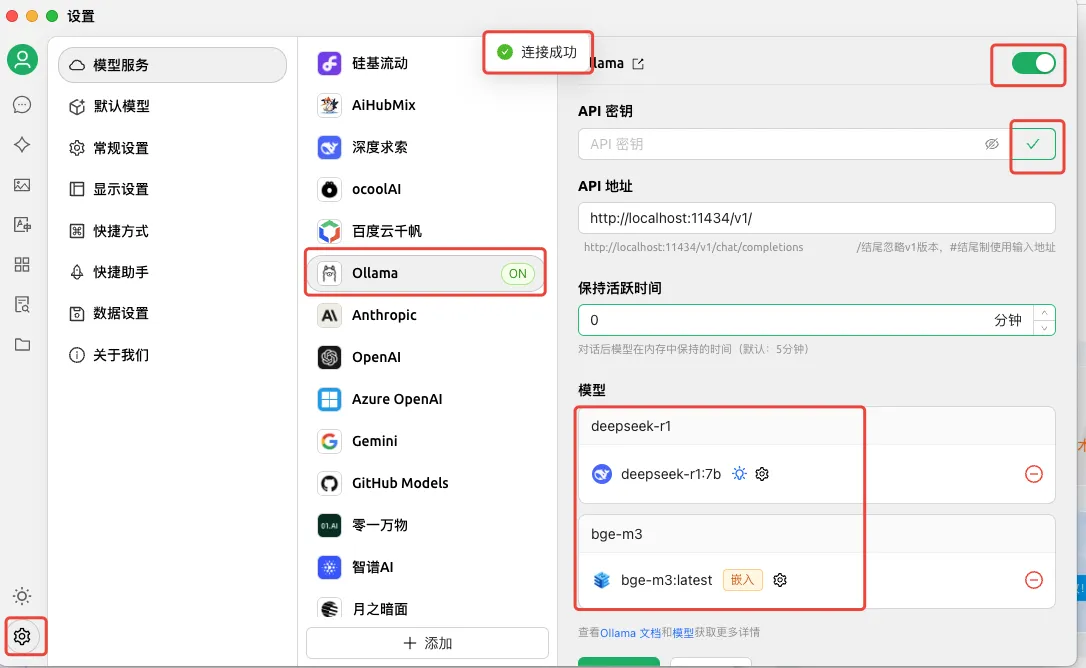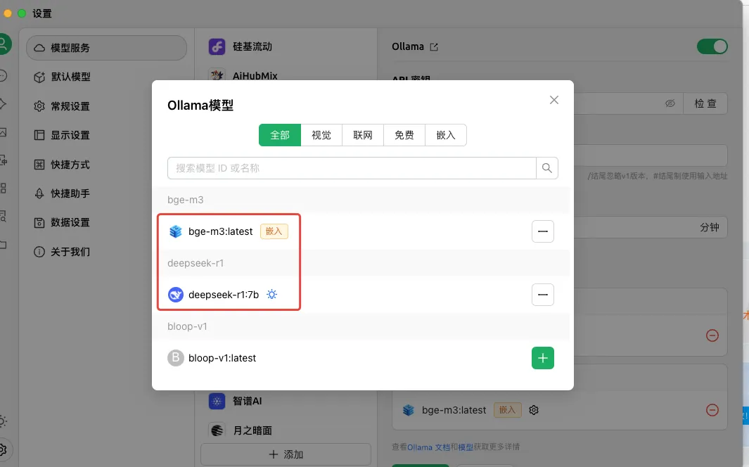 如图,在 Cherry Studio 设置页面配置模型服务,选择 Ollama, 模型选择弹窗中选中 deepseek-r1:7b 和 bge-m3:latest