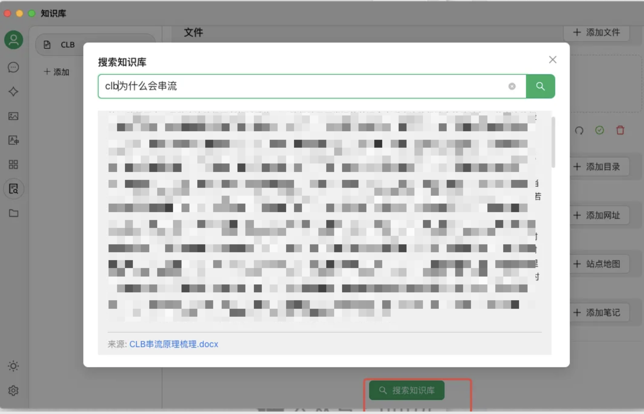 添加素材完成后,可以使用【搜索知识库】进行测试验证,如下图所示,我这里提供的素材是 clb 串流原理的文档,所以提问了【clb为什么会串流?】。模型会根据知识库中的素材进行回答,并标注来源和匹配度等。