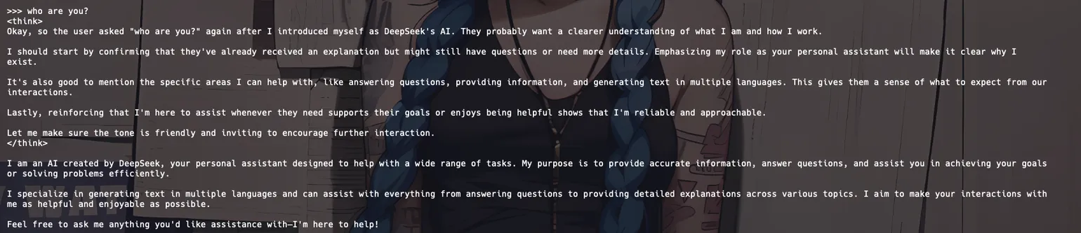 运行 deepseek-r1 成功后,可以再终端进行问答测试