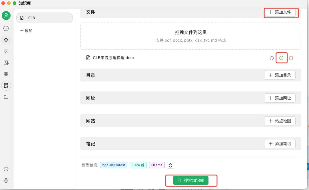 在Cherry Studio 知识库配置页卡中,按照自己的需要新建【知识库】,嵌入模型选择【bge-m3:latest】, 然后上传知识库素材,可以添加文档(支持pdf/doc/xlsx/ppt/txt/md 等),也可以添加目录(这个极其方便)、网站等,添加完以后出现绿色的对号,表示向量化完成。