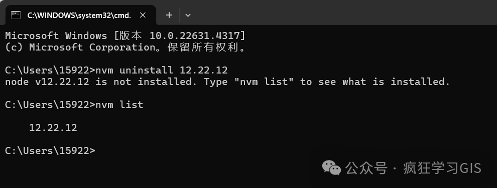 执行上述代码,可以看到它说无法删除这个版本,建议用nvm list命令来看一下当前自己电脑中到底安装了哪些版本;可是如果真的用了nvm list命令,就会发现它又告诉你确实安装了这个版本,无限循环。如下图所示。