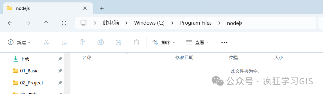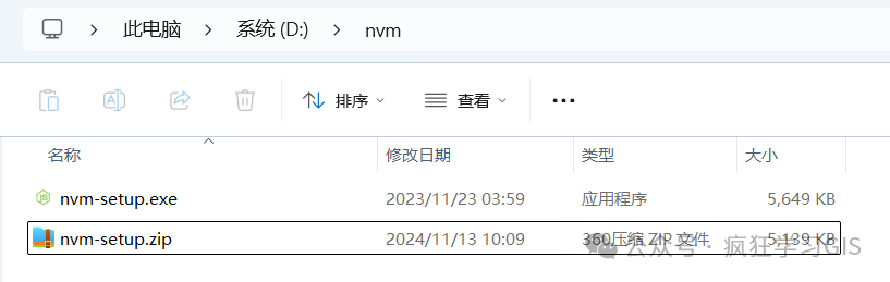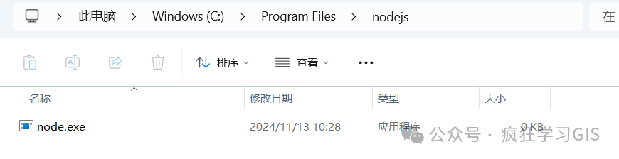 随后,再进入用NVM下载Node.js时的安装路径,将其中大小为0的node.exe文件删除,如下图所示。