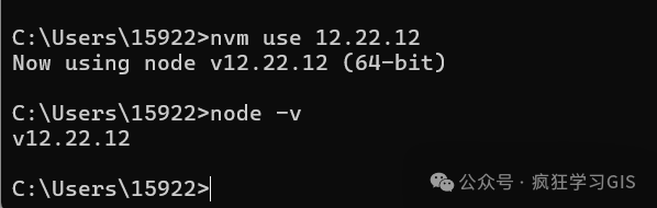 安装完毕后,首先通过nvm use 12.22.12命令,将NVM当前所用的Node.js的版本切换到指定版本;随后,可以通过node -v命令,可以查看NVM当前所用的Node.js的版本,如下图所示。