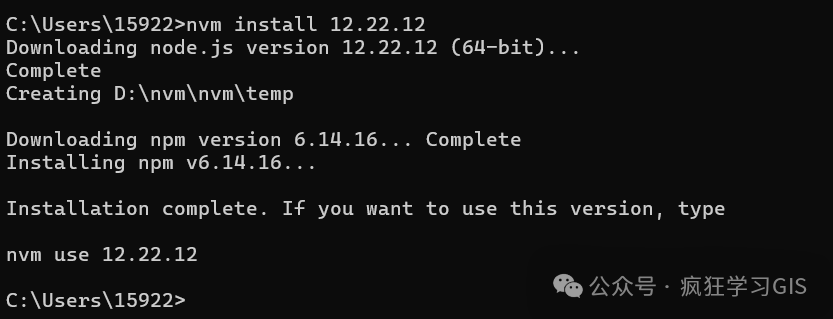 随后,重新执行安装语句(在我这里就是nvm install 12.22.12这句),就可以看到已经能够正常安装了,如下图所示。