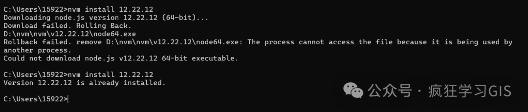 虽然上图中,第二次执行nvm install 12.22.12,也会说已经安装过此版本的Node.js;但是第一次执行后的那个提示,就是说明确实没有安装成功。