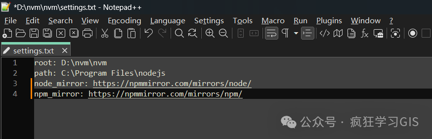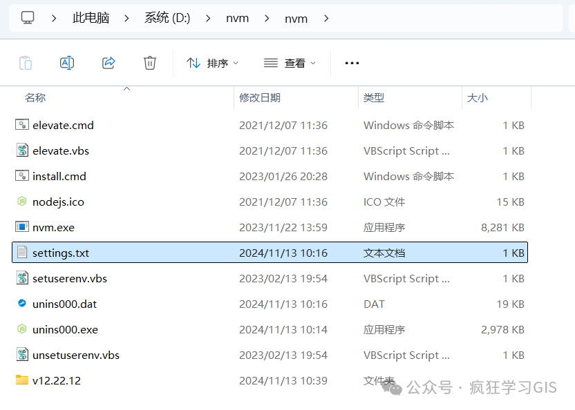 首先,进入我们前面指定的NVM的安装路径,并找到其中的settings.txt文件,如下图所示。
