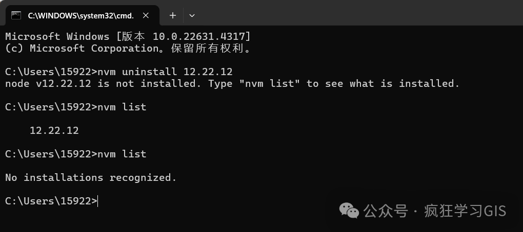 针对上述这种安装Node.js失败,且NVM还误以为已经安装过它的情况,其实也比较好解决。