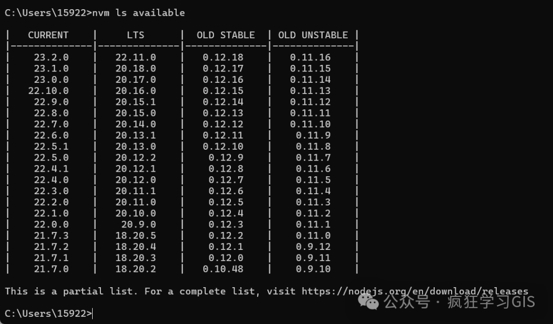 首先,在命令行中输入如下代码,查看当前可以下载、安装的全部Node.js版本