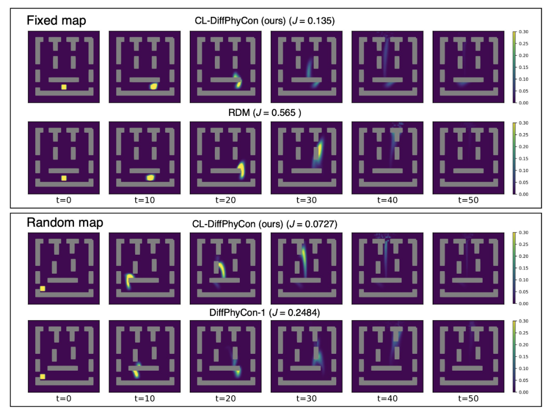 图 3. 在固定地图(上图)和随机地图(下图)两种环境下,CL-DiffPhyCon 与表现最好的对比方法在二维烟雾间接控制上的可视化对比。横向表示不同物理时刻。控制目标 J 越低,表示控制效果越好。