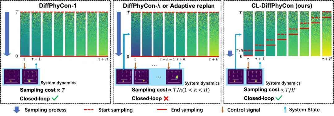 图 1:本文的 CL-DiffPhyCon(右图)相较于以往扩散控制方法(左图和中图)的优势。通过采用异步去噪框架,该方法能够实现闭环控制,并显著加快采样过程。其中,H表示扩散模型包含的物理时间窗口长度,DiffPhyCon - h表示每隔h个物理时间步进行一次包含T个去噪步骤的完整采样过程,然后将采样的控制信号序列中的前h个依次用于开环控制。这里没有展示与 DDIM [5] 的结合。