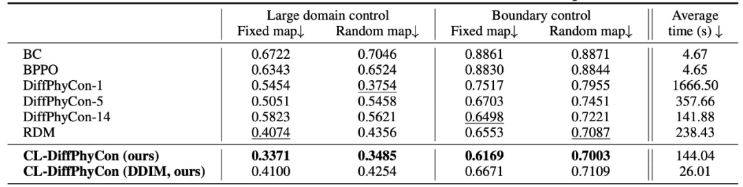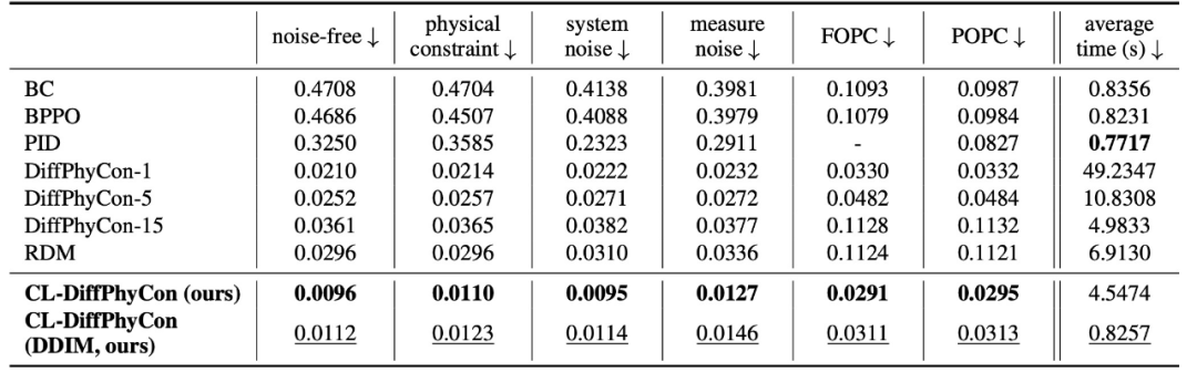 对比方法包括一系列经典控制方法、模仿学习、强化学习和扩散控制方法,如 PID、行为克隆(BC)、BPPO、自适应重规划扩散控制(RDM)以及 DiffPhyCon 等,并对这些基线方法进行了适当调整,以保证公平比较。由于两个实验中的轨迹较长,研究人员将 DiffPhyCon 扩展为三个版本:DiffPhyCon-h(h∈{1,5,H - 1})。这里的 DiffPhyCon - h表示每隔h个物理时间步进行一次 DiffPhyCon 的完整采样过程,然后将采样的控制信号序列中的前h个用于开环控制(见上文图 1)。