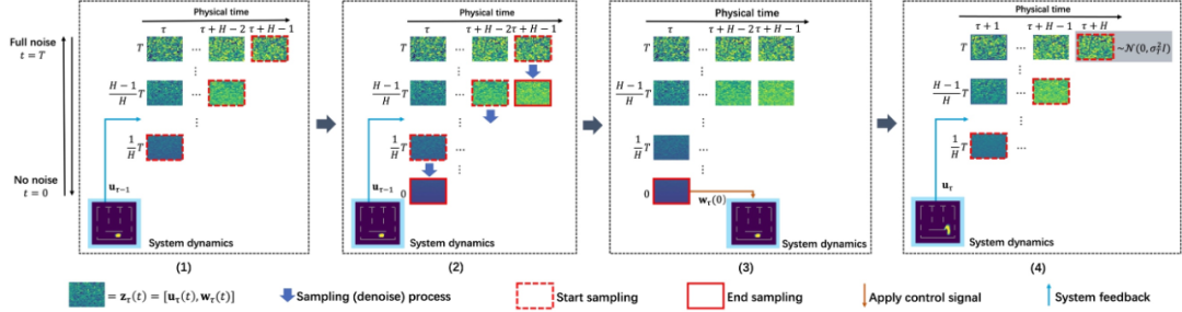 图 2:CL-DiffPhyCon 用于闭环控制的流程:(1) 获取当前物理时刻系统状态和 “对角线形” 异步联合隐变量;(2) 利用异步扩散模型去噪;(3) 将采样到的控制信号应用到系统;(4) 获取系统反馈的最新状态和更新后的 “对角线形” 异步联合隐变量,进入到下一个物理时刻。