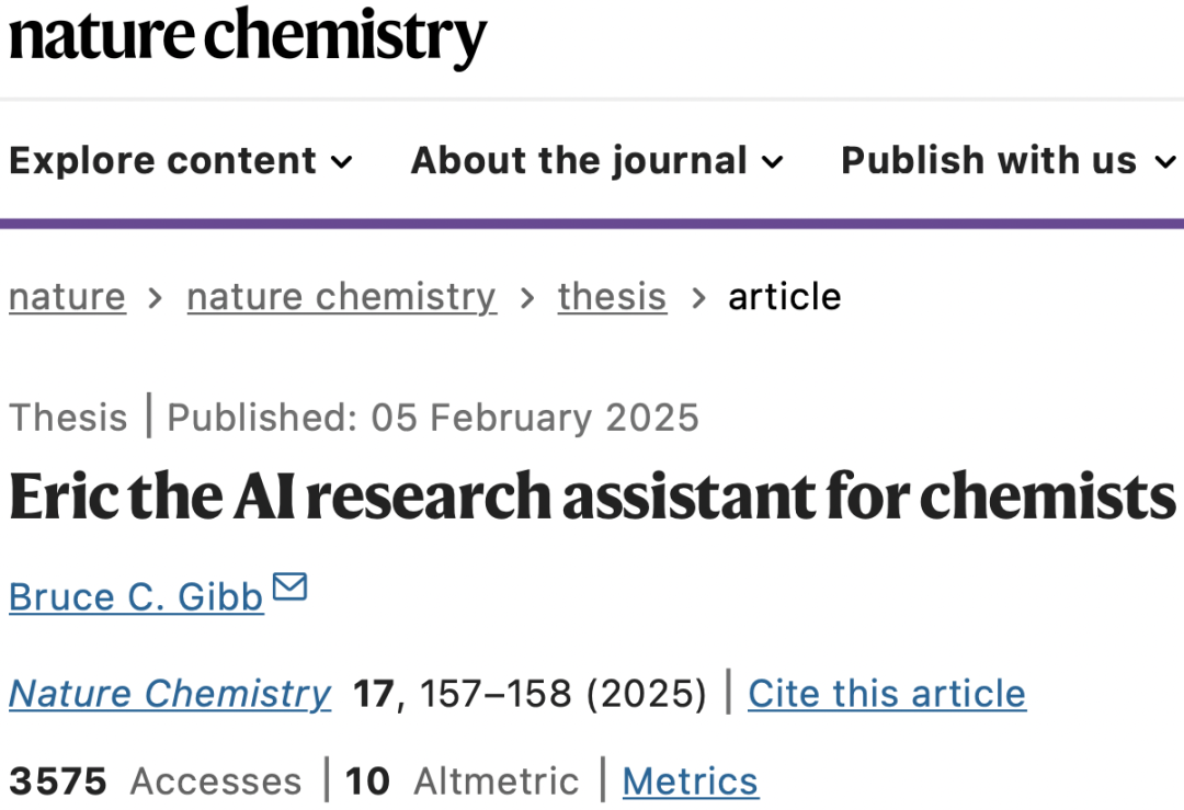 2025年2月5日,来自美国杜兰大学化学系的Bruce Gibb在Nature Chemistry上发表文章Eric the AI research assistant for chemists,讨论了开发AI的自上而下和自下而上的方法,强调了文化鸿沟的问题和数据质量的挑战。他还介绍了Eric--未来化学家潜在的AI研究助手。