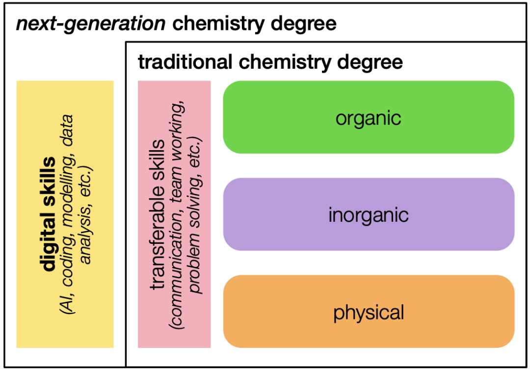 图1 数字技能培训与其他可转移技能一样,必须与化学培训中的传统概念正交,并在应用环境中定期重新审视,并确定就业技能示例