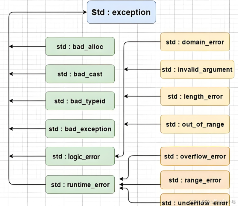 C++标准库中定义了自己的一套异常继承体系库,基类是exception,所以我们在程序中只需要在主函数中捕获exception即可,要获取异常的具体信息直接调用what函数即可;而且what是虚函数。