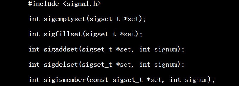上面五个函数是增删查改,第一个函数是将一个信号集置为零,第二个函数是将信号集全部设置为1,第三个函数是添加新的信号到信号集当中,第四个函数表示在信号集中删除指定信号,第五个函数是在指定信号集中查找指定信号。