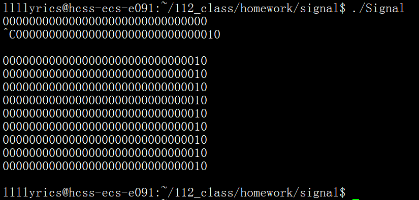 因为ctrl+c默认处理方式就是结束进程所以这里,我们看到的是结束,没有看到pending表的变化,我们加入signal函数进行信号捕捉,进行我们的自定义方法,不结束进程,查看pending表的变化状态: