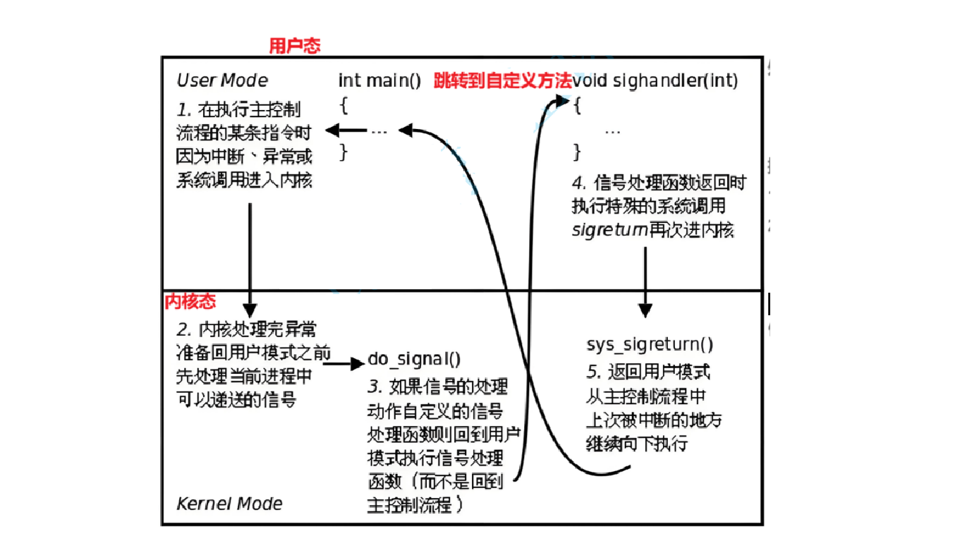 假如我们写了一个代码,当我们进行某些系统调用的时候,会出现中断,中断之后会进入内核态,当进入内核态之后,会处理当前进程中可以传递信号,如果信号的处理方式是自定义处理方式会直接返回用户态调用自定义方法,处理完后返回内核态,从上次中断的地方继续执行。