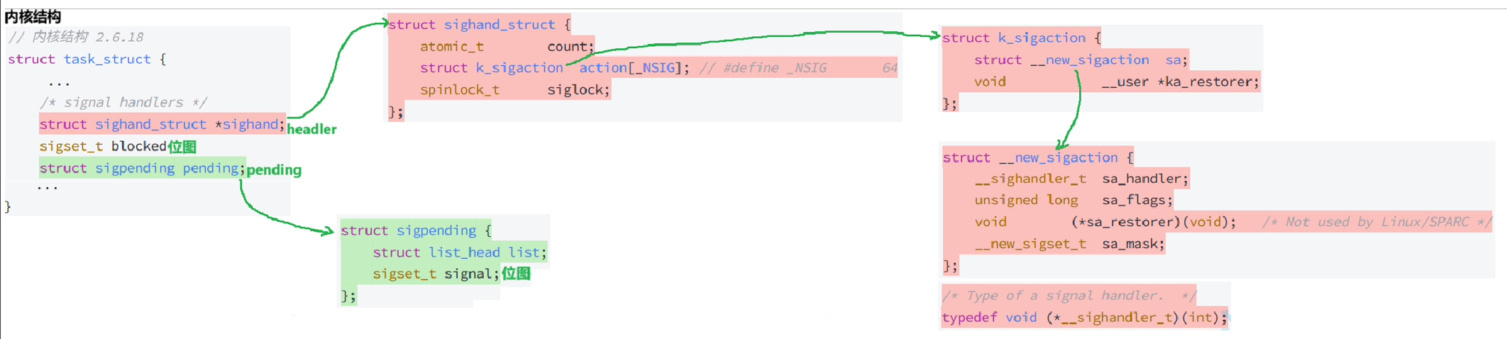 前两张表是位图,第三张表是函数指针表。 我们从左到右说起: 第一张表是位图,比特位的位置是信号编号,比特位的含义是是否阻塞信号,1表示阻塞当前编号的信号,0表示为阻塞当前信号。 第二张表也是位图,比特位的位置是信号编号,比特位的含义是是否收到信号,1表示收到信号,0表示未收到信号。 第三张表是函数指针表,表示每个信号对应方法,当收到信号之后,我们将拿着信号编号,然后在handler表中查找对应信号的方法。