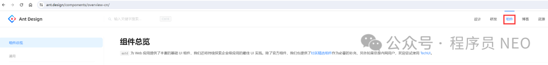 到这里项目创建好了,Ant Design 也安装好了,接下来就是使用 Ant Design 了,那么如何使用呢?我们可以通过官方文档来查看,点击 组件: