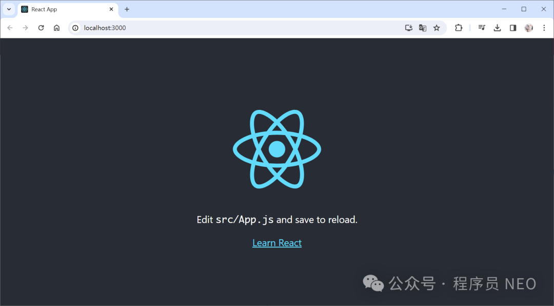 上图可以看到已经创建成功,可以通过 npm start 试着启动一下: