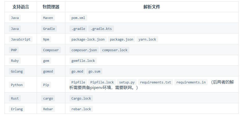 OpenSCA现已支持以下编程语言相关的配置文件解析及对应的包管理器,覆盖主流开发语言。