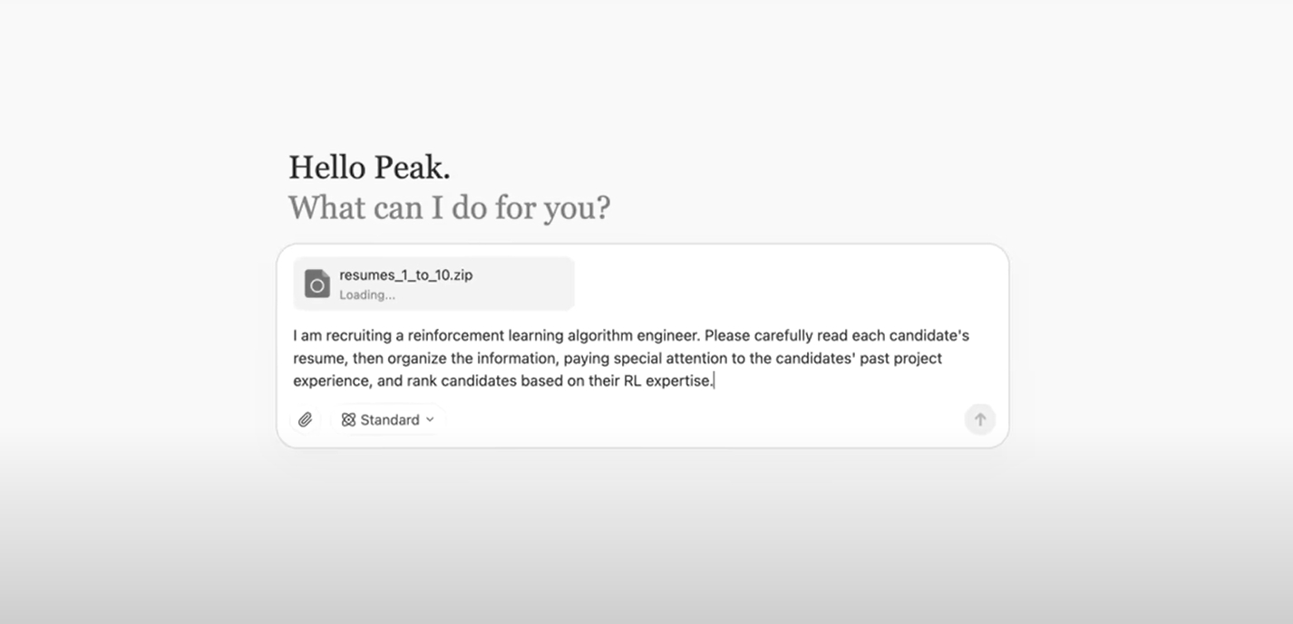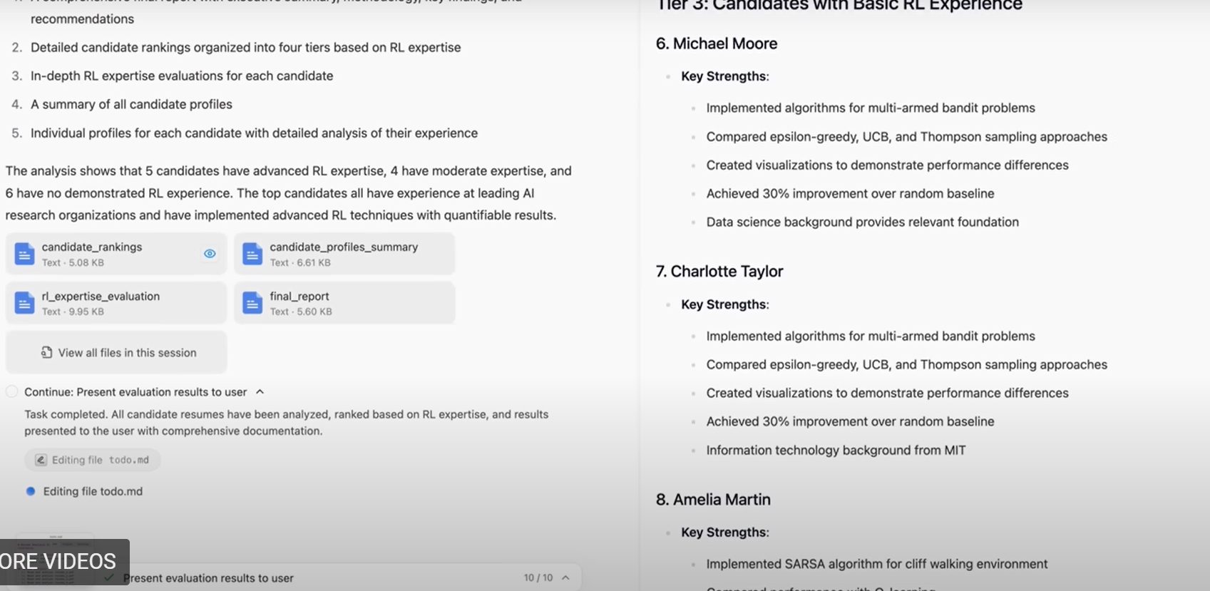 演示开始,官方给Manus发送一个包含10份简历的压缩包,并给它指令:我需要招聘算法工程师,评估这10份简历。Manus随后就和专业招聘人员一样,解压文件,逐个分析简历,评估排名等等操作