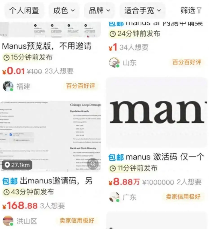 目前Manus仍然处于内测阶段,想要试用Manus需要邀请码,而官方未大规模放出邀请码,导致在某鱼上邀请码卖出了999元到100万元的天价