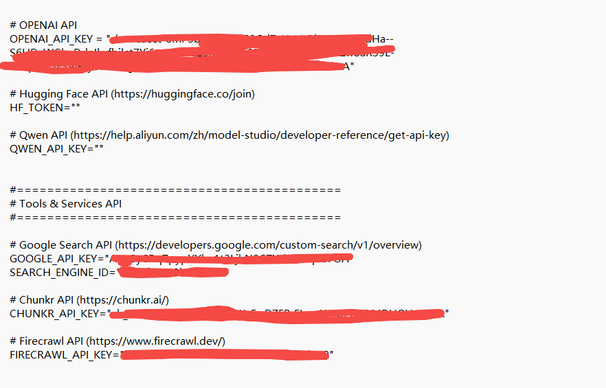 除了模型的API KEY,还需要配置一些要用的工具的API KEY。配置文件里很贴心地附上了链接,大家直接访问去创建即可。(友情提示:部分工具的API KEY是付费的)。