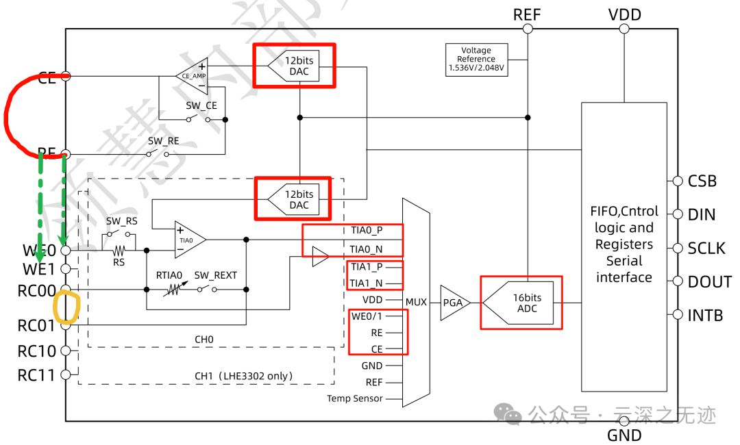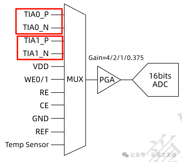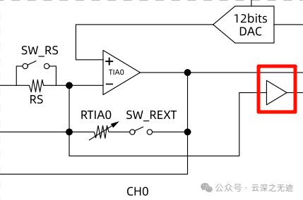 01只有一路的TIA,在关键的路径上面都有开关,可以在不使用的时候关闭或者是按需的打开一些开关,来以较低功耗维持反应环境,因为这个反应环境的稳定还是要时间的。DAC的精度也高,12bit很细腻了。