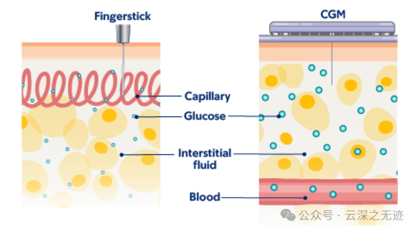 CGM 读数可能与指尖釆血读数有所不同。 指尖釆血测量的是血液中的葡萄糖水平。 CGM 测量的是组织液中的葡萄糖水平。 组织液指体内细胞之间的液体。