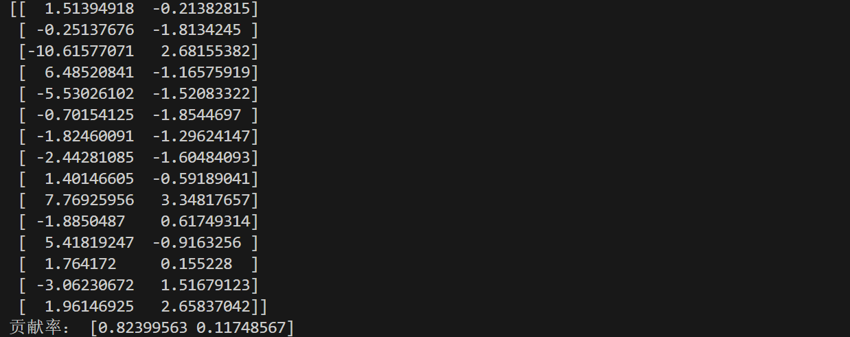 下面的这个是参数=2的时候的计算结果:第一个是82%,第二个是11%,两个的贡献率的求和,专业的叫法是:累计贡献率在(85-95)这个区间里面,所以我们的维度选择2就可以了;