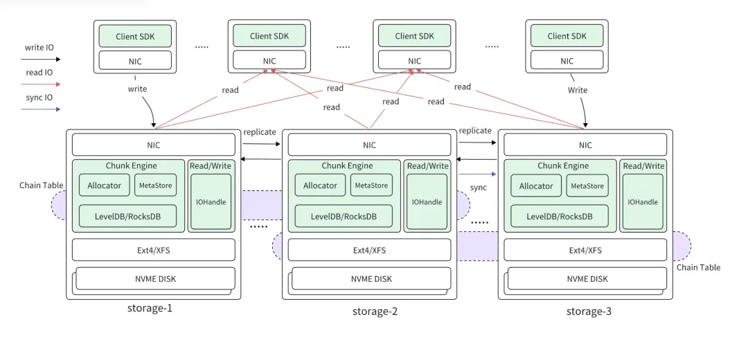 每个数据节点通过 Ext4 或者 XFS 文件系统管理其上的多块 NVME DISK,对内部模块提供标准的 POSIX 文件接口。数据节点包含几个关键模块:Chunk Engine 提供 chunk 分配管理;MetaStore 负责记录分配管理信息,并持久化到 RocksDB 中;主 IO handle 提供正常的读写操作。各个数据节点间组成不同的链式复制组,节点之间有复制链间写 IO、数据恢复 sync 写 IO。