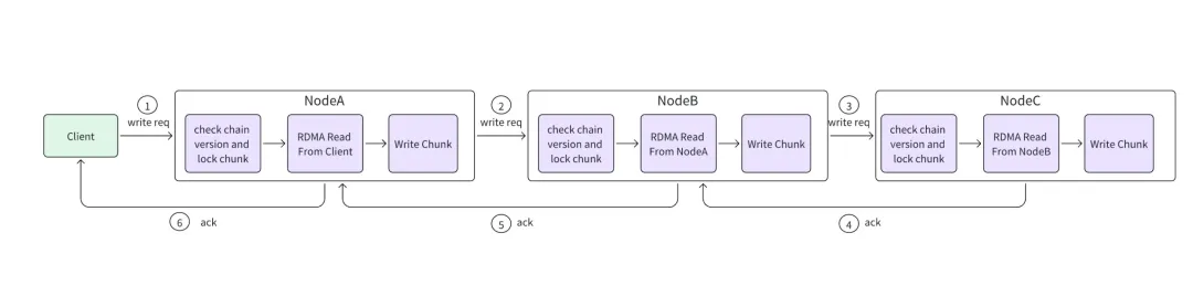 3FS 的写采用全链路 RDMA,链的后继节点采用单边 RDMA 从前序节点读取数据,相比前序节点通过 RDMA 发送数据,少了数据切包等操作,性能更高。而 3FS 的读,可以向多个数据节点同时发送读请求,数据节点通过比较 commit version 和 update version 来读取已经提交数据,多节点的读相比标准 CRAQ 的尾节点读,显著提高吞吐。