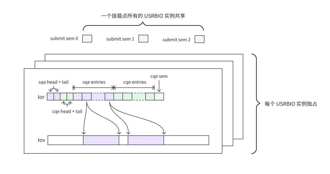 基于共享内存 RingBuffer 的通信机制被广泛应用在高性能存储、网络领域,在 DPDK、io_uring 中均有相关实现,一般采用无锁、零拷贝设计,相比其它通信的机制有明显的性能提升。3FS 借鉴了这个思路实现了 USRBIO,和原有的 FUSE 实现相比,有以下特点: