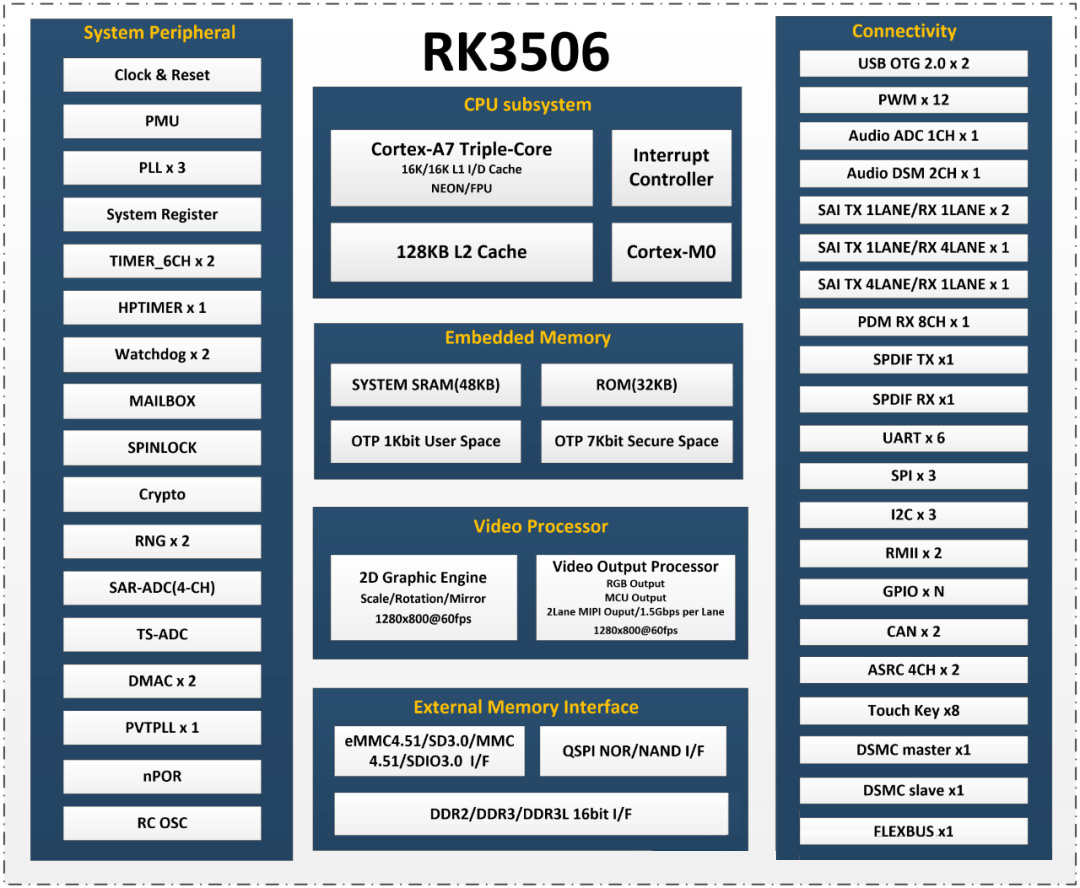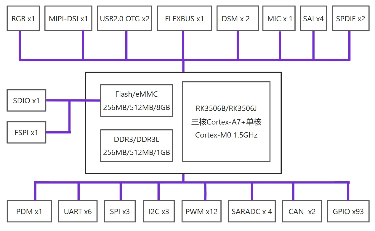 内置SAI、PDM、SPDIF、音频DSM、音频ADC、USB2.0 OTG、RMII、UART、CAN等, 可以满足不同的应用开发需求。RK3506 SoC 内部组成,如下图所示: