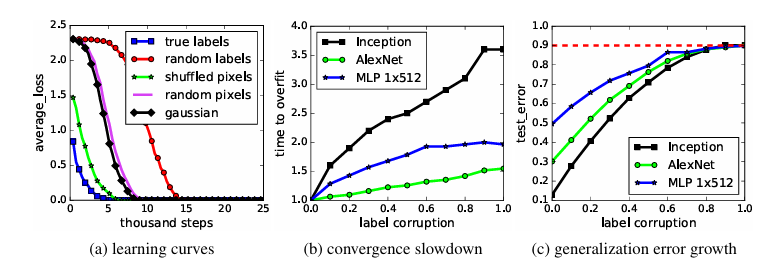 在 CIFAR10 上拟合随机标签和随机像素。(a) 显示了各种实验设置的训练损失随着训练步骤的衰减。(b) 显示了不同标签损坏率的相对收敛时间。(c) 显示了不同标签损坏下的测试误差(也是泛化误差,因为训练误差为 0)。