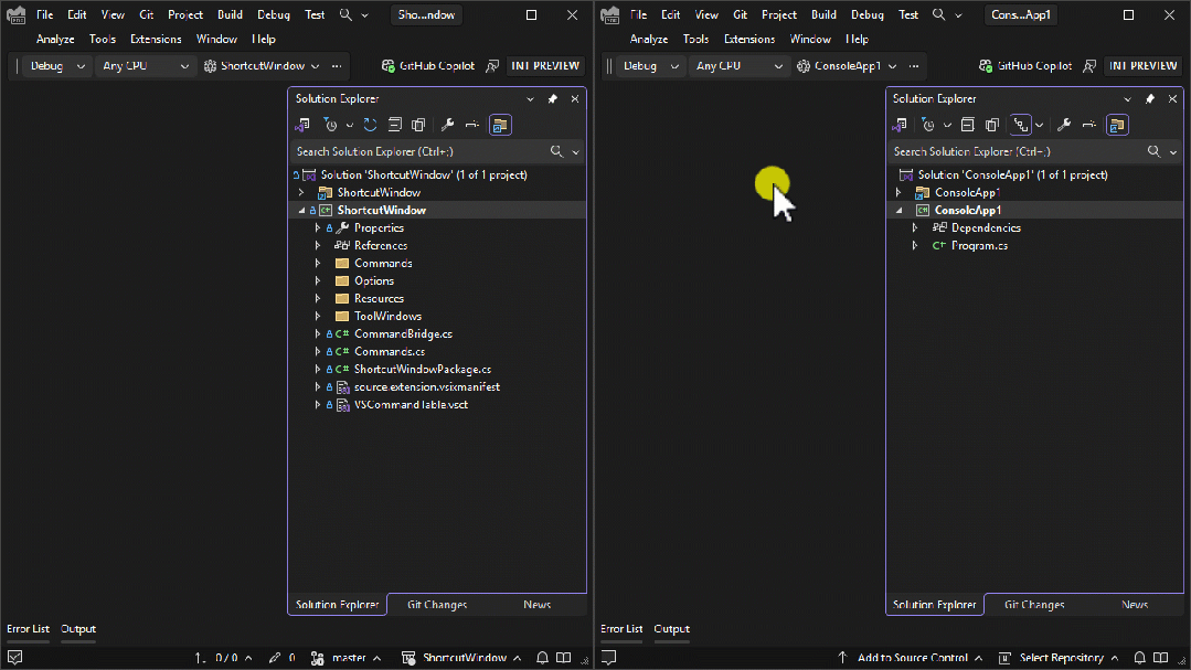 现在,您可以在 Visual Studio 实例之间无缝地复制、粘贴或拖放文件。此功能适用于大多数项目类型,并提高了工作流畅度。