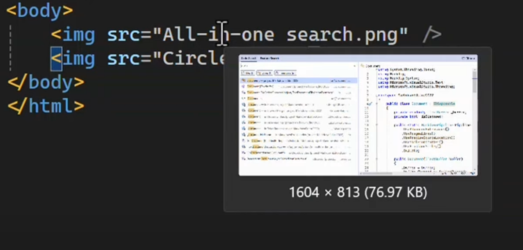 如何在代码中可视化引用的图像?Visual Studio 的图像悬停预览解决了这个问题,当您将鼠标悬停在引用的图像上时,它会显示快速预览,包括尺寸和文件大小。虽然是一个小小的改进,但对生产力有着大大的影响。