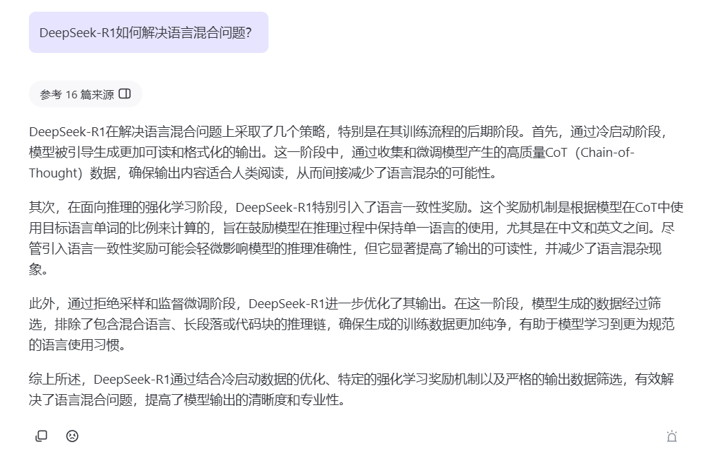 比如我搜索“DeepSeek-R1如何解决语言混合问题?”