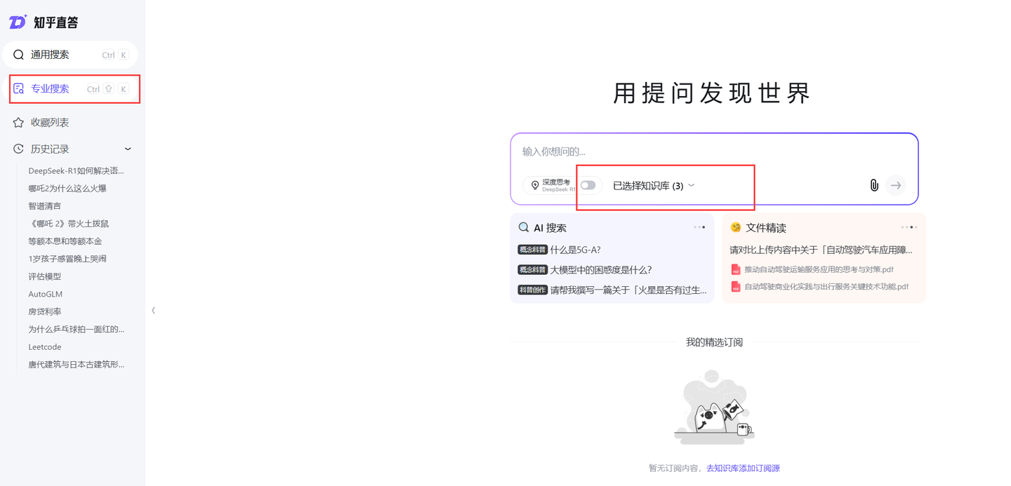 另一个优势在于,知乎直答接入了知识库功能,可以基于DeepSeek构建自己的个人知识库,它的入口在左下角这里: