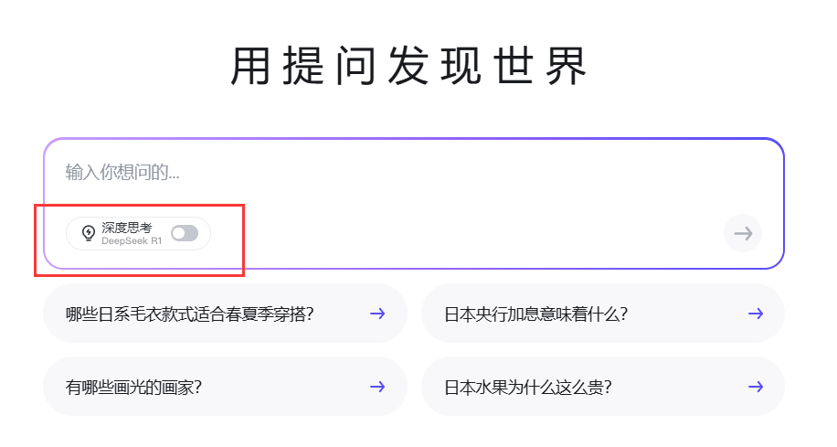打开知乎直答的网页,可以发现下面有一个小小的入口,直接打开就可以使用DeepSeek-R1模型: