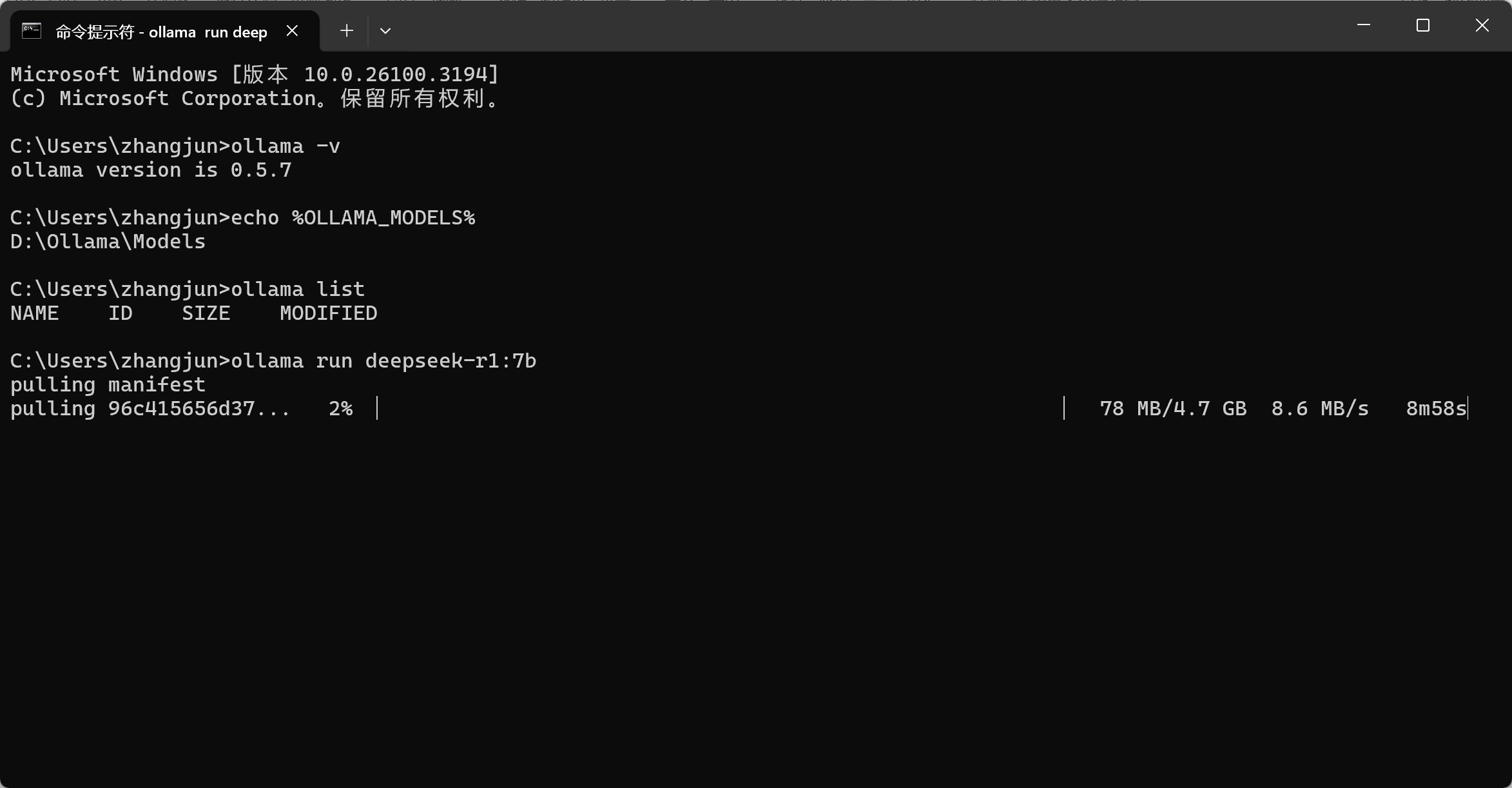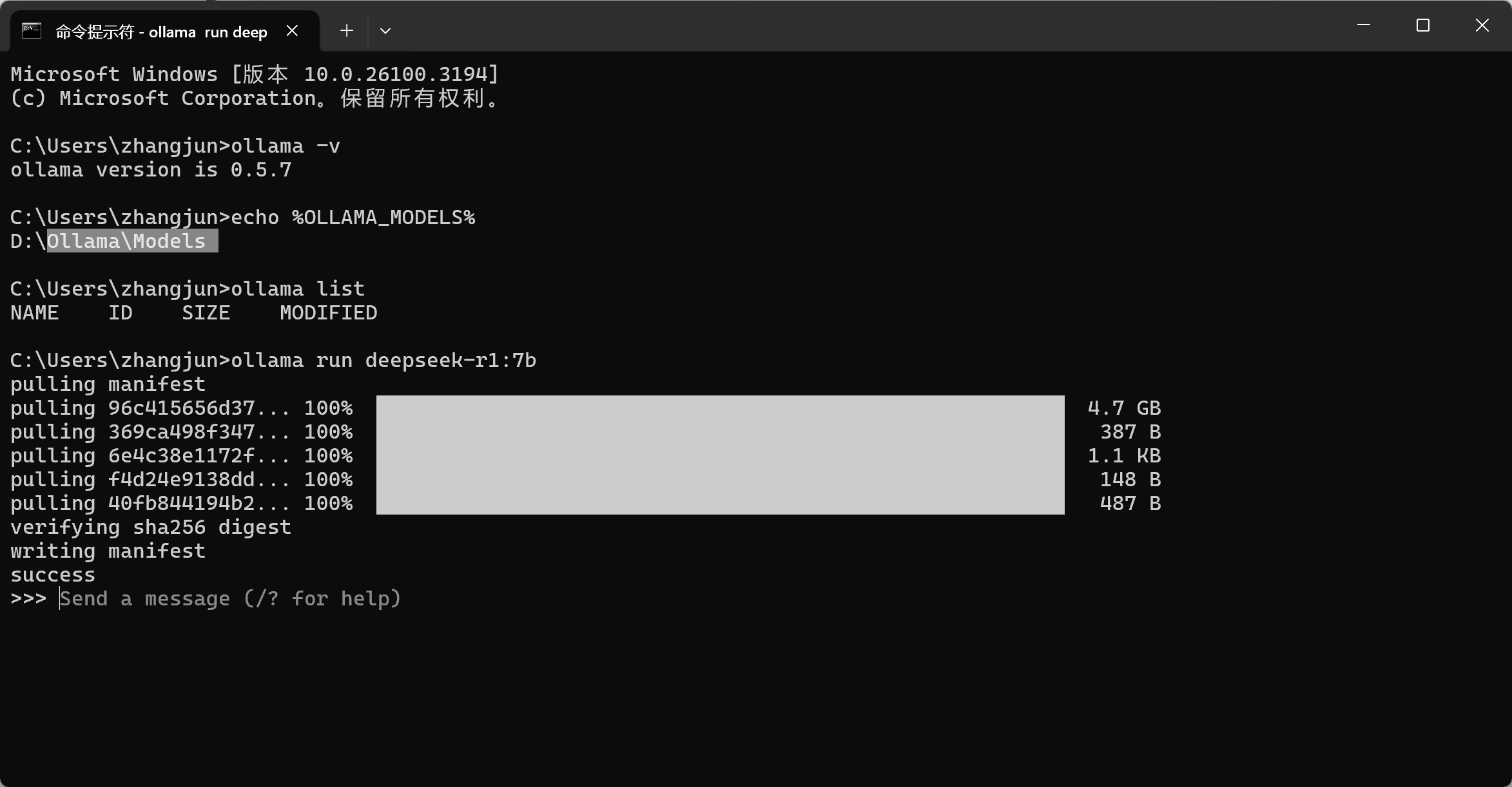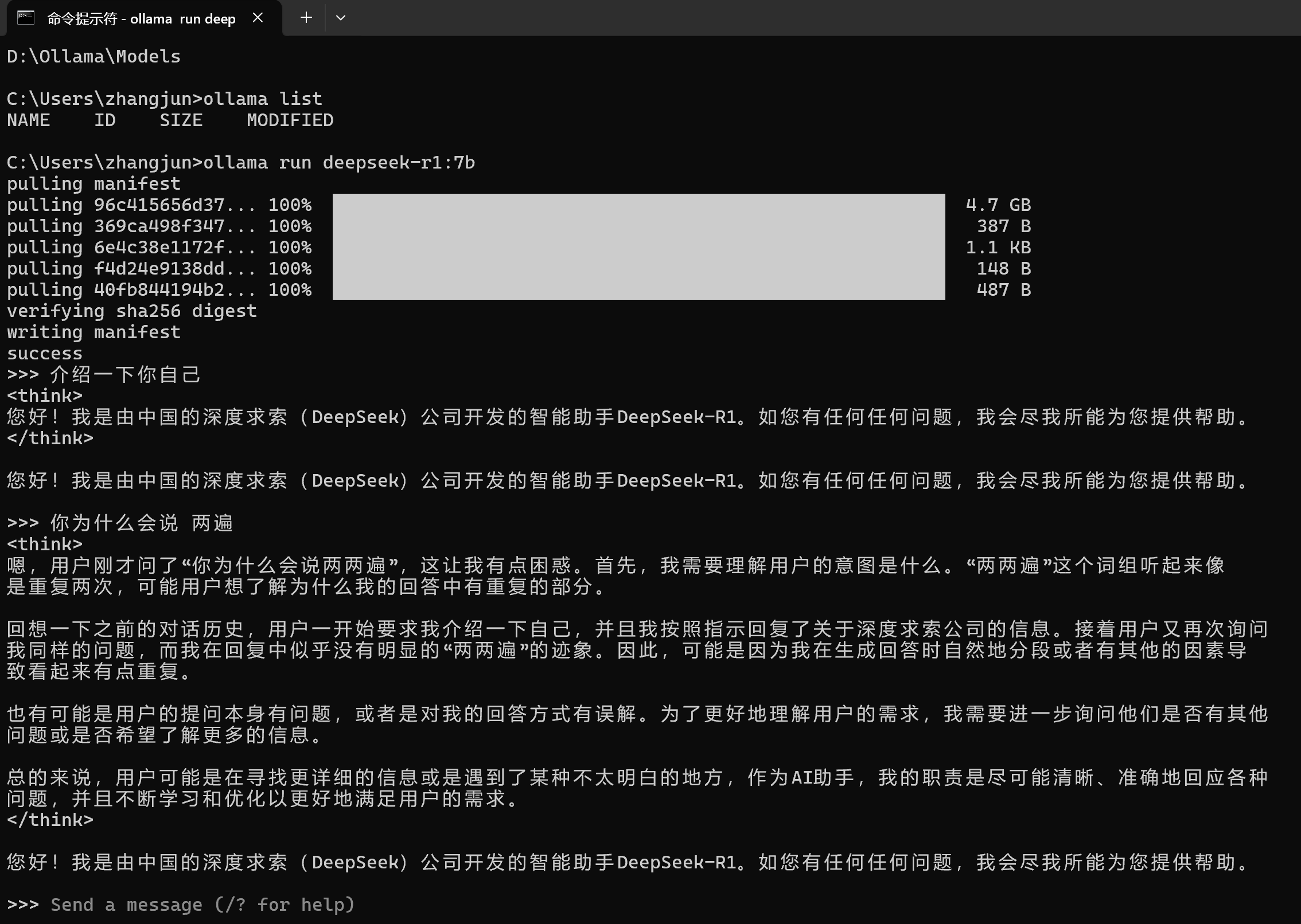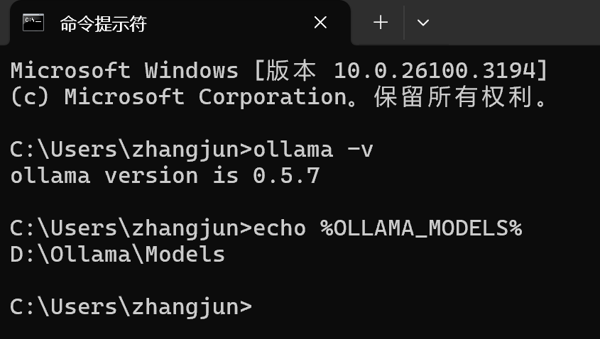 为了确保模型路径已成功修改,可以使用以下命令验证: echo %OLLAMA_MODELS% 如果输出显示为你设置的路径,则表示环境变量已正确配置。