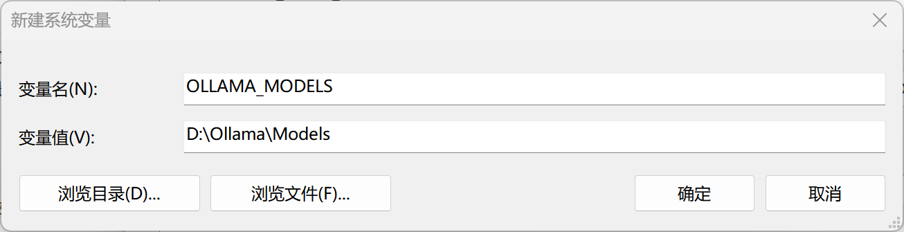 按下 Win + R 键,输入 sysdm.cpl,然后按 Enter 键,打开“系统属性”窗口。 在“系统属性”窗口中,单击"高级",点击“环境变量”按钮。 在“环境变量”窗口中,点击“新建”按钮。 在“新建系统变量”窗口中,输入变量名 OLLAMA_MODELS,变量值为你希望的模型存储路径(例如 D:\Ollama\Models),然后点击“确定”。 点击“确定”保存环境变量设置。