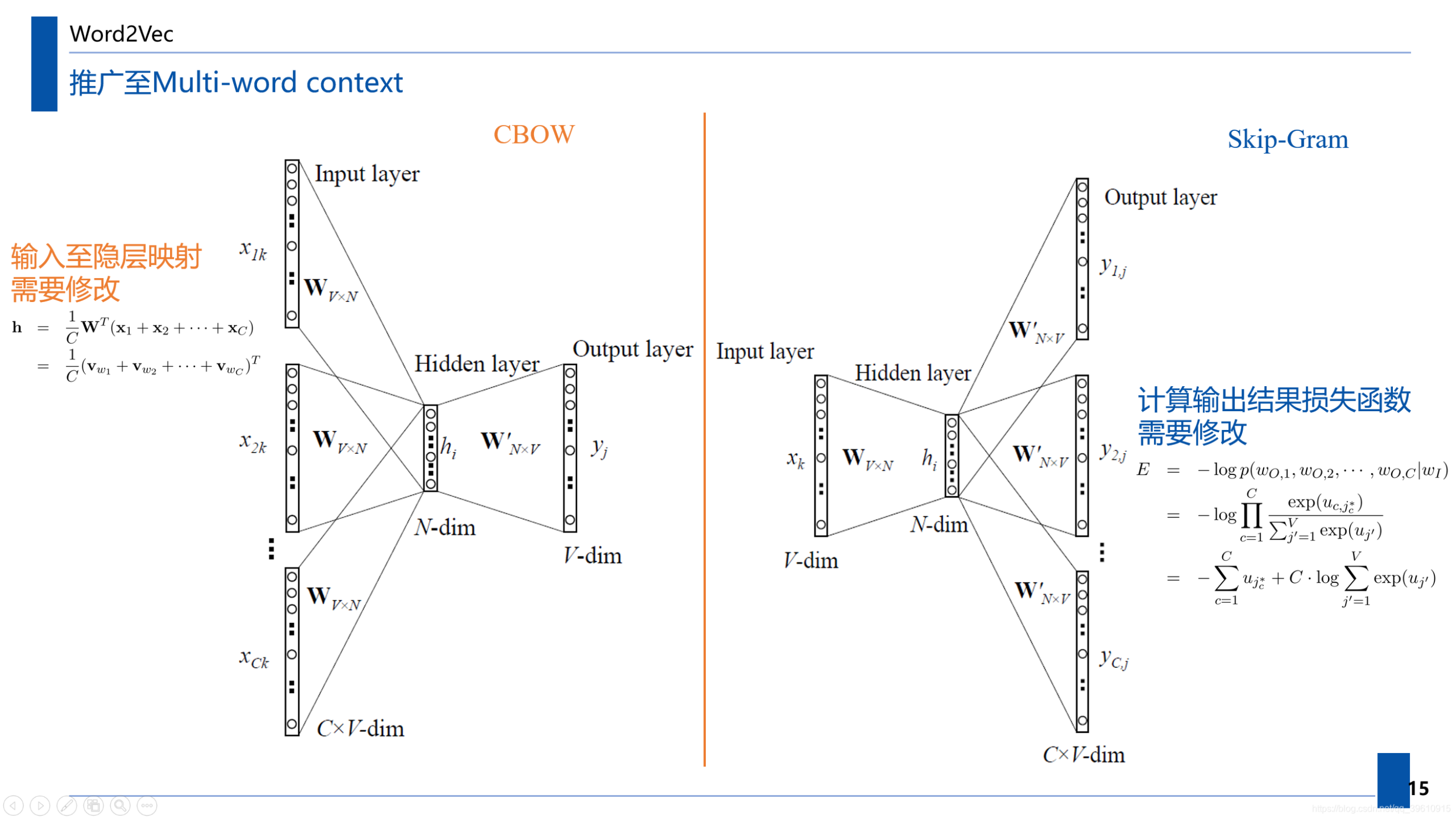CBOW Multi-Word Context Model 了解了Simple CBOW model之后,扩展到CBOW就很容易了,只是把单个输入换成多个输入罢了(划红线部分)。